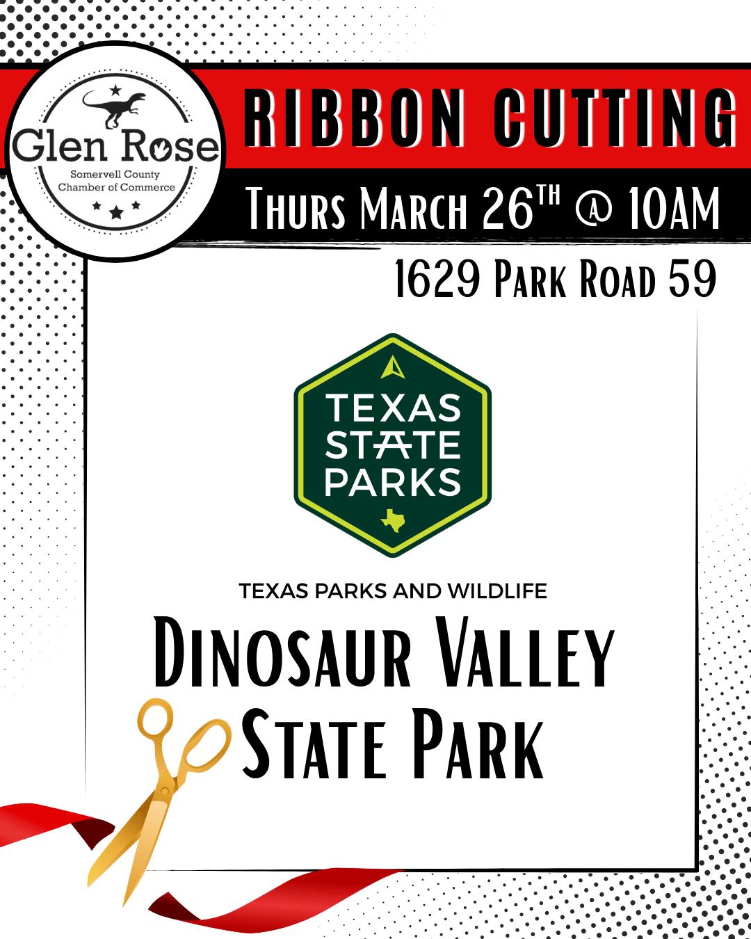 Join the Glen Rose Chamber of Commerce as we celebrate Dinosaur Valley State Park with a special ribbon cutting! We’re excited to highlight one of Glen Rose’s most iconic destinations and the incredible experiences it brings to our community and visitors from all over.