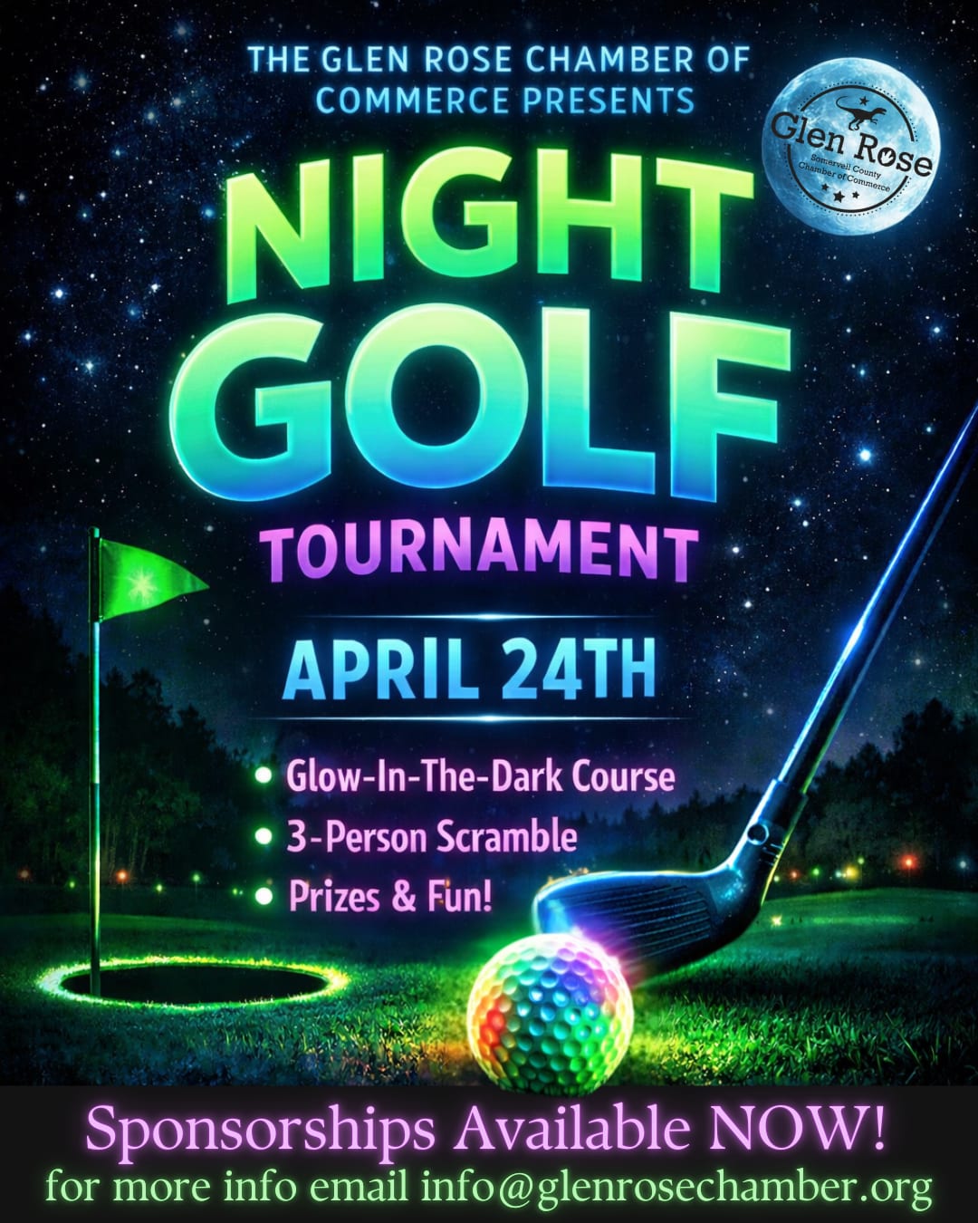 Get ready for one of the most exciting events of the year! The Glen Rose Chamber of Commerce Night Golf Tournament is a one-of-a-kind evening on the course filled with glowing fun, friendly competition, and community connection. Teams will tee off after dark for a unique golf experience under the lights, complete with glow gear, great sponsors, and plenty of surprises along the way. This event brings together local businesses, chamber members, and friends to support our community while enjoying an unforgettable night of golf and networking.Images